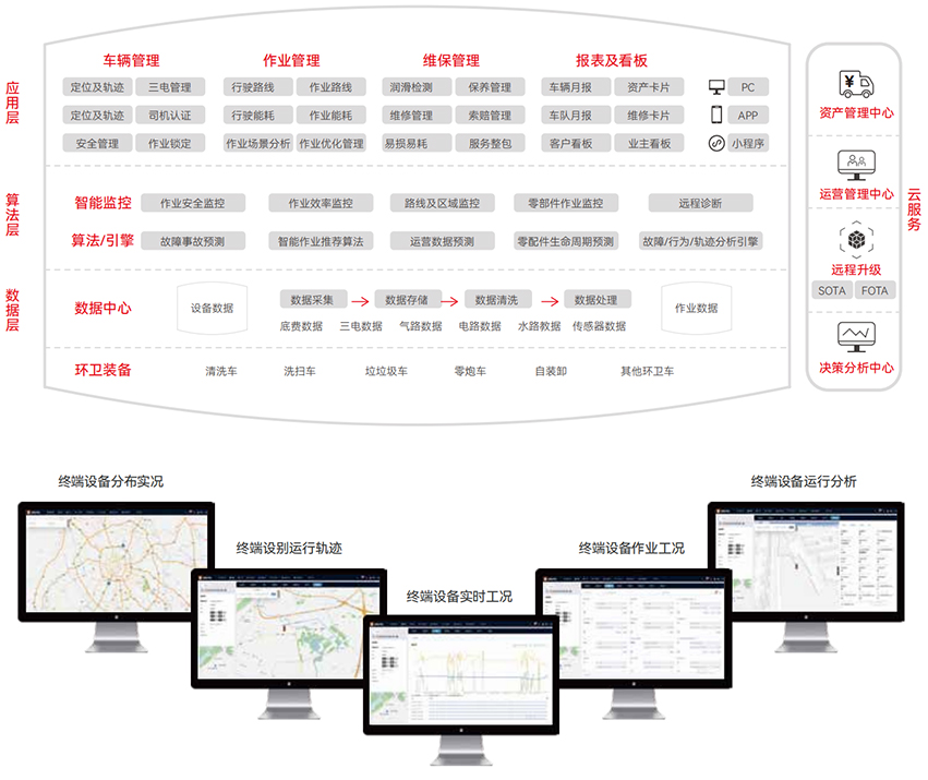 实现了车辆数据的全面互通和全车OTA能力,通过底盘和上装的协同控制,精确采集作业数据,推进车辆作业和平台监控的数字化精细化管理